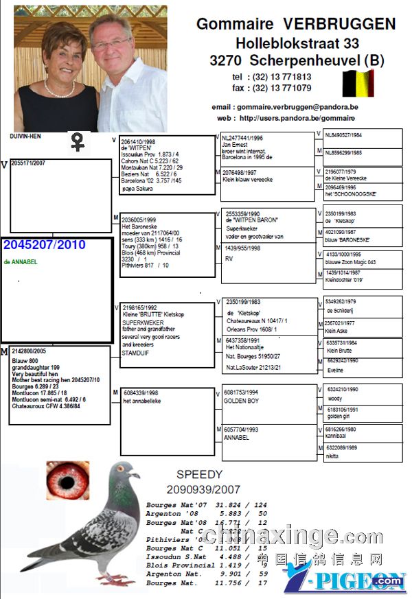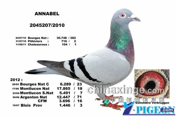 比利时名将“电脑”戈马利.佛布鲁根(Gommaire Verbruggen)作翔的代表鸽“安妮”(ANNIE) B10-2045091,2012年入赏蒙特吕松540公里半全国冠军以及亚精顿12447羽全国10位、CFW半全国3696羽冠军,“安妮”理所当然成为2012年比利时鸽坛最受瞩目的风云名鸽。 安妮号非常有可能入赏2012年比利时KBDB中长距离鸽王冠军。“电脑”舍内另一羽战绩辉煌的选手“安娜贝尔”(Annabel) B10-2045207,预计也将会入赏全国鸽王前10位,据了解“安娜贝尔”已高价售出。