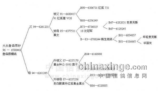 从后代鸽的赛绩上来看,这羽詹森原棚鸽的引进是极为成功的,那么“大头詹森”为什么会有如此重要的育种价值呢?为了使鸽友们对“大头詹森”鸽有一个更深一层的了解,现将血统书公布如下:(见血统1),从血统书中我们可以看到,其祖系血统有许多大名鸽的血缘,可谓集中了詹森原棚鸽的名鸽精华。从全系血统上看,重点来自麦克斯和红狐血统。对詹森鸽稍有研究者都会知道,詹森兄弟鸽是近亲繁殖种鸽的高手。他们所引进的一羽外来鸽环号B59-1005026“华丽灰”,依然有着詹森鸽的一半血统,采取的配对方式大多是以二代配三代以上的互配,即表兄妹,堂兄妹互配。所以在“大头詹森”鸽血系表中,无论是红狐狸,还是麦克斯、小火箭,老白眼等,都有着丝丝相连的血缘关系。比如父系中的红狐狸血系,最早的血缘关系来自詹森兄弟早期引进的库勒曼鸽系,在与棚中“夏丽布劳石板灰32”的直女“大胖雌”的后代相配,育出了具有优秀杰出赛绩的 “奇狐雌45”,也称神奇红母鸽“B45-411053♀鸽”,她是一羽和詹森另一名鸽“迅捷号”一样赛绩超群,飞速无敌,无论任何天气下出赛,都能飞出冠军,突显出祖代双方竞翔基因特性的母鸽,至今许多后代依然发挥着及其重要的作用,比如红狐“B90-6306731”等等。更为重要的是“奇狐雌45”的育种价值较飞翔能力更胜一筹,她能将祖代双方的优秀竞翔基因性能延续遗传给后代,即她的后代一代代都飞出佳绩。她的直子“红公49”直女、“修恩理奇51”直孙,“斑格51”外孙女,“布劳克54”,重孙“斑格59”,“斑格64”等等都是詹森棚中及其重要的作种鸽之一。尤其是这一血统又作出近亲旷世名鸽“老麦克斯”,其血统摘录如下: