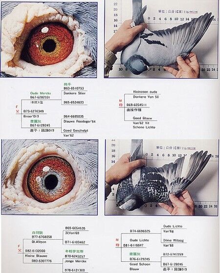 6、这16羽种鸽中有8羽种鸽存在程度不同的眼志或面砂速度线,且都采用速度线相配。虽然这一配法同样难以理解,但和前面所说的相近配的道理却恰好吻合,速度线的特点已得到了鸽友们的普遍认可,若它出现在名血或名鸽眼中,其价值更是连城。用两只成绩突出速度线鸽互配,其目的只有一个,就是要后代的眼睛变得更好看,且飞行速度更快。