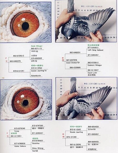 (5)用华丽灰孙代与019孙代作出的雄鸽配老麦克斯直孙与华丽灰直孙作出的雌,这还是一个双重回血配的成功例子。(6)用019子代雄配年轻麦克斯直孙雄与019的平辈华丽灰直子雌的子代。其子代的品质不容多想,是任何人都梦寐以求的。