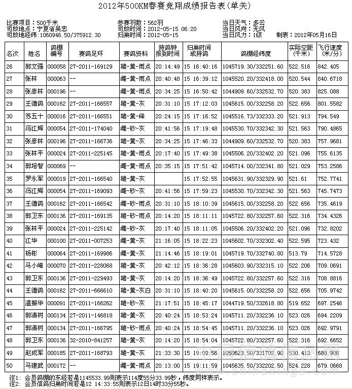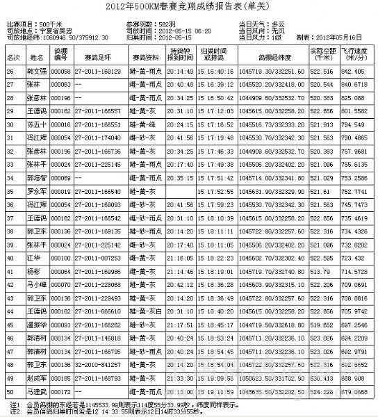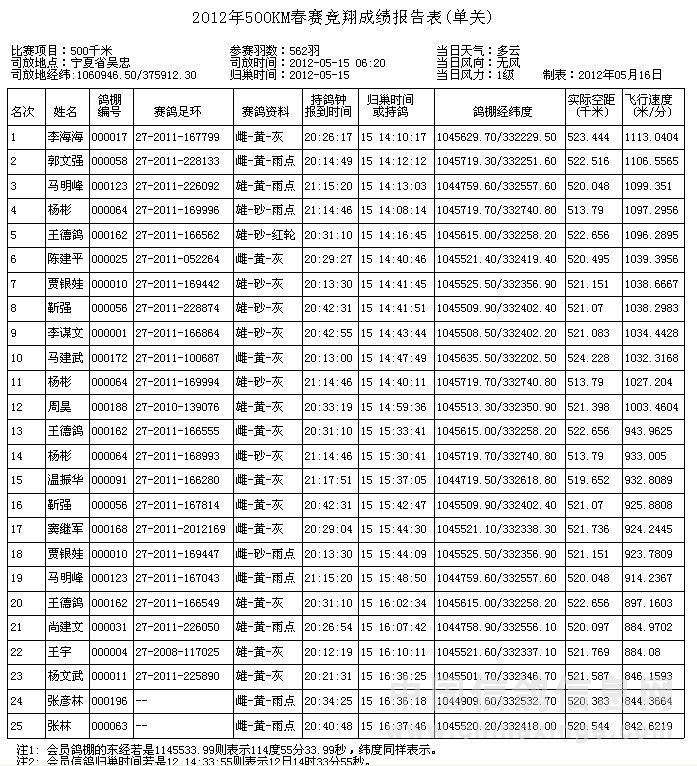 陇南市信鸽协会春季500KM比赛已落下帷幕。以下排名是综合排名,现将成绩公布如下(点击可看大图):