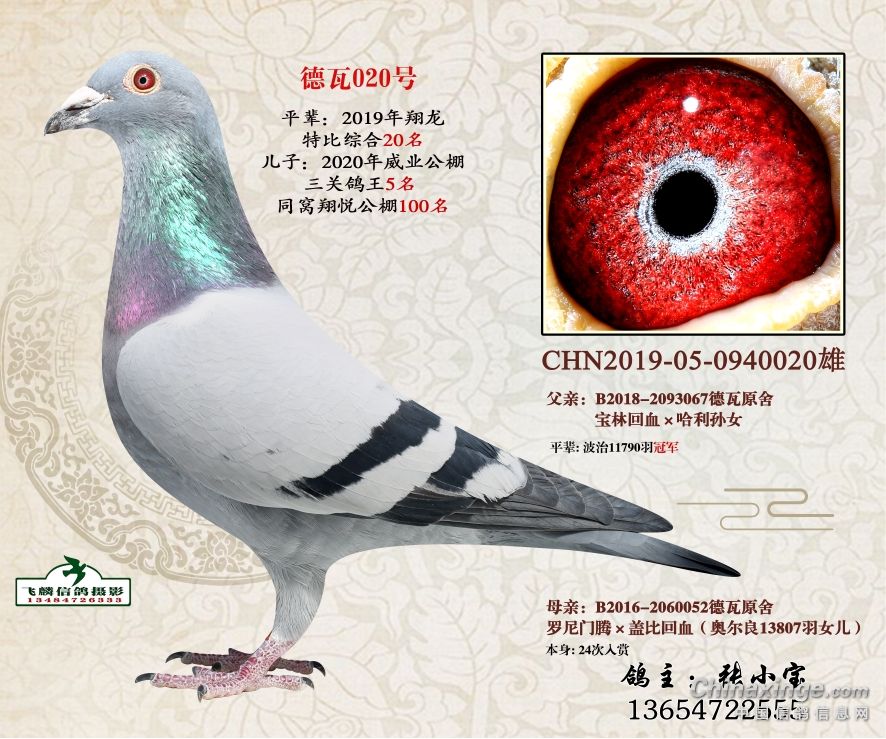 亚伯特德瓦 鸽王5名的父亲是德瓦020号 用百分之50的德瓦鸽王5名 回交百分百德瓦的俩羽雌鸽 一个是姑侄配对,一个是孙子配对奶奶的平辈