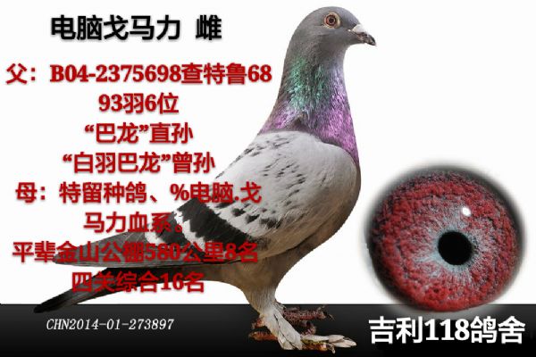 本鸽舍位于北京北部北京市昌平区,属北京北端的鸽舍之一.本舍主血:胡本、电脑.戈马力、凡龙、超级73、林波尔、汤姆硬汉、詹森红狐731、詹森019系、桑杰士。由于工作原因,很少参加地方赛,只是交公棚。成绩只能代表过去,与鸽友共享胜利喜悦、共同赛出非凡成绩,才是吉利118鸽舍的追求。本舍主力种鸽为鸽王级别,成绩比较稳定!!……