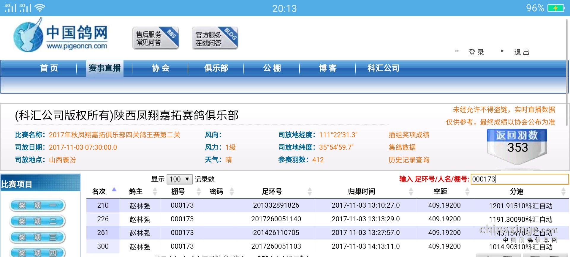 比赛成绩以比赛竞翔表所公布的成绩为准!