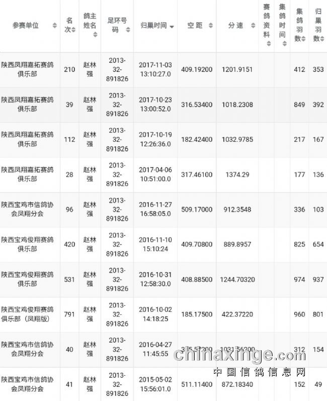 2017秋季四关鸽王第一关320km成绩