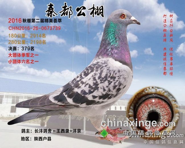 2016年秋赛结束应朋友之约。去凤翔秦都赛鸽公棚拍卖会现场。驱车一个半小时来到拍卖会所在地,凤翔西凤大酒店是不是来的太早了好像没有多少人。在欣赏获奖鸽的过程中。被一羽雨点雌鸽吸引。(鸽主是户县鸽友,王西录)前面几关表现平平。决赛获得379名引进鸽子是缘分。拍卖规则是从400名往前排。起拍价是800元,379名被我夺下花魁最后以1500元成交。价钱在我预期之内我成了2016年秋赛秦都公棚500km决赛379名的新主人。