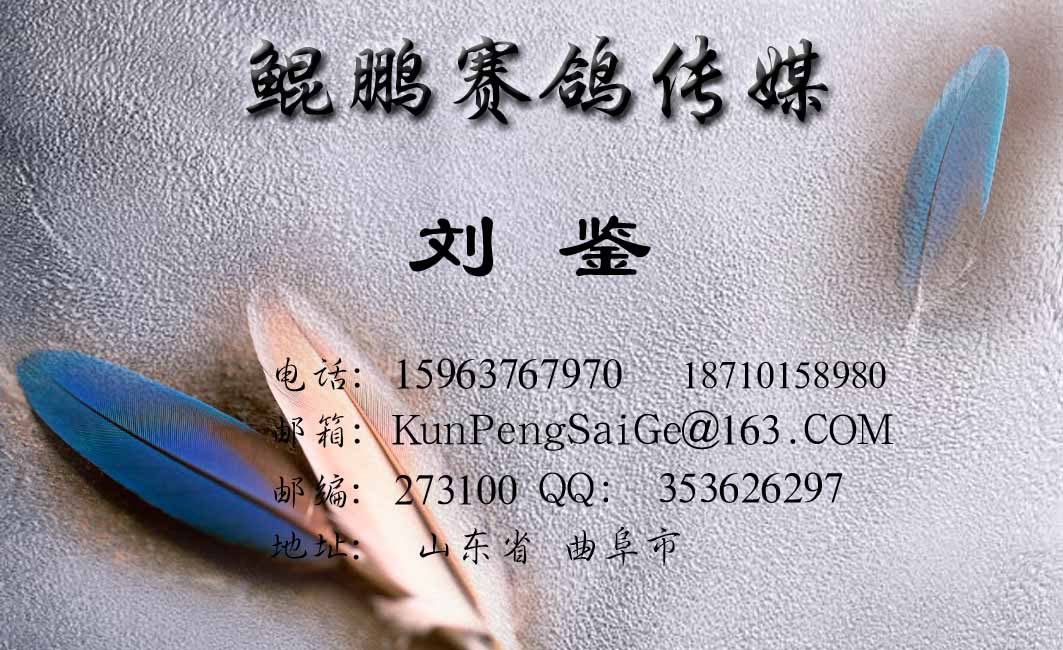 鲲鹏赛鸽传媒是集赛鸽摄影,照片制作,网页设计,名片设计,拍卖手册制作,杂志广告设计于一体的专业赛鸽传媒工作室,最新购进影楼级专业单反相机,专业的拍摄与制作水平为您的爱鸽呈现最完美的一面联系电话:15963767970QQ:2271832976……
