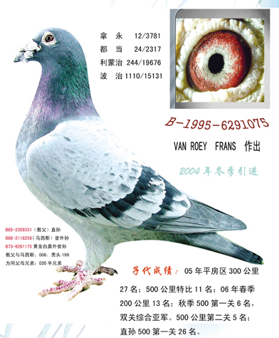 简介:鸽舍坐落在哈尔滨市平房区,本人89年开始驯养信鸽,95年结婚没有条件而停止养鸽。出于对赛鸽运动的热爱。2004年春季建立鸽舍.于当年的秋季开始参加当地鸽会和俱乐部的比赛。舍内的主力种鸽16对.其中包括:华普利、盖比、詹森019、慕利门、杨迪汉、万侯、霍夫肯、司翠克鲍特、盖诺斯、瓦继卡、阿列维什、戈马力。感谢哈尔滨宇航鸽舍王宇生先生半师半友的支持和帮助!及辽宁凌海兄弟鸽舍,王满昌的友情支援。由于本舍规模有限,现将已成功育出优秀赛绩鸽……