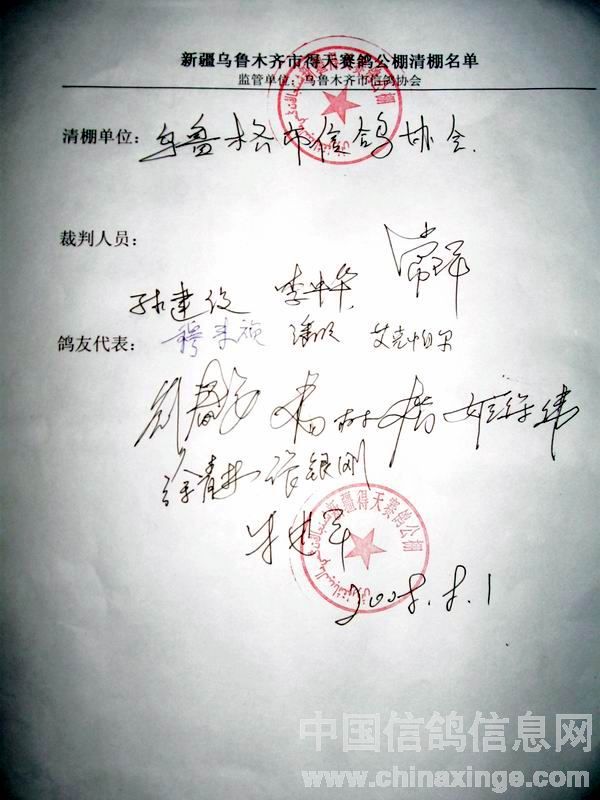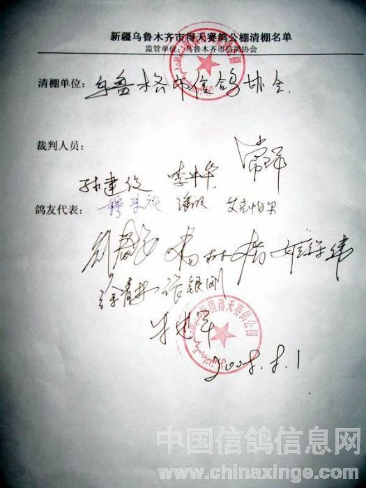 新疆得天赛鸽公棚于2008年8月1日由市鸽会委派裁判在广大鸽友代表的监督下采用电子扫描和手工检录同步进行存棚清点。