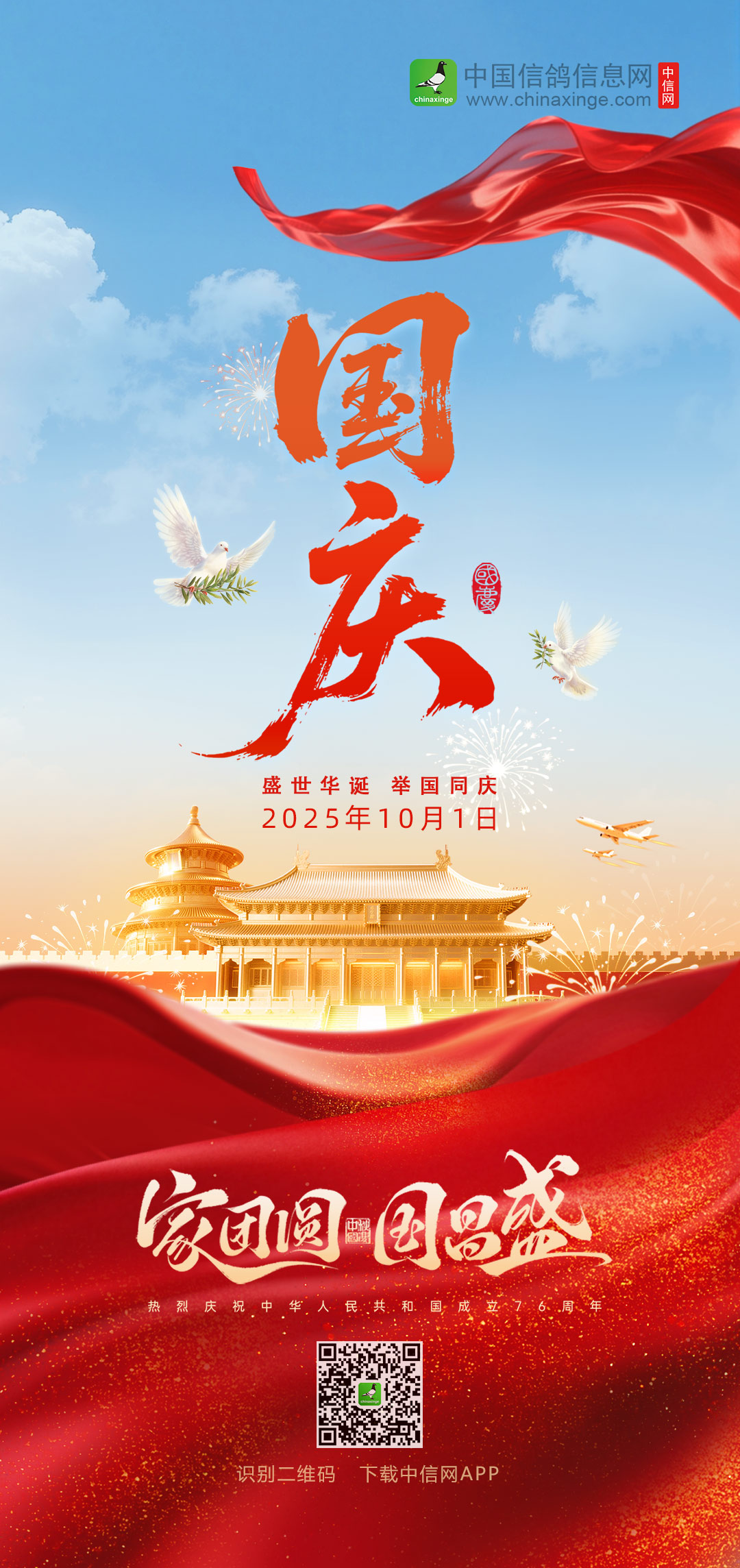 山河壮丽,岁月如歌,举国同庆,喜迎华诞!热烈庆祝中华人民共和国成立76周年!中国信鸽信息网祝全国鸽友们国庆节快乐!