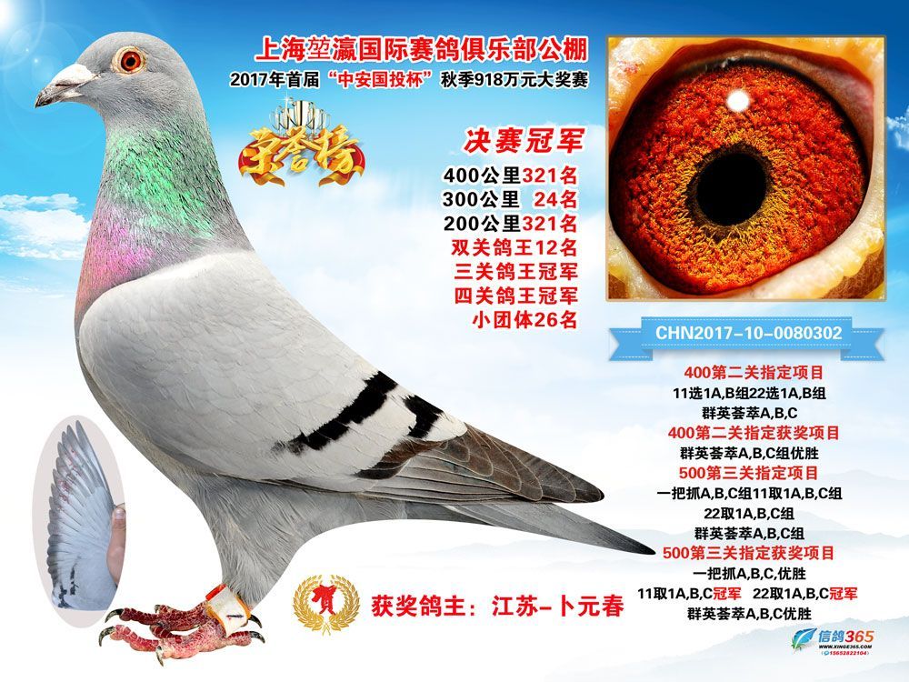 2017年上海堃瀛国际公棚首届决赛总冠军.四关鸽王总冠军.决赛指定通炮总冠军.汽车大奖赛总冠军.和281名的好成绩.小团体赛26名成员之一2017年天津津福公棚.加强赛556公里获得:亚军2017年上海蓝色海湾公棚首届.环号10-0080328.350公里233名.450公里55名.500公里16名.十项指定获奖!580公里决赛获得:298名328名340名团体赛14年名成员之一……