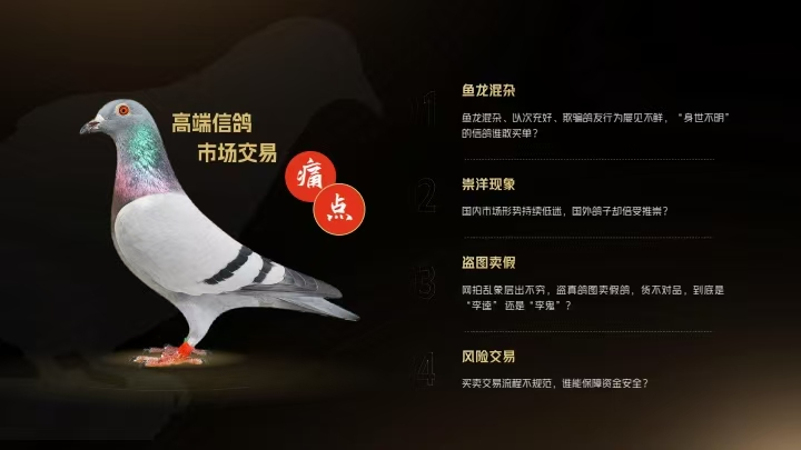 1.信鸽真伪问题:市场以次充好“狸猫换太子”的信鸽让买家鸽友陷入入手困境,无法准确鉴别信鸽真伪,货不对版,给买入和训飞带来风险。