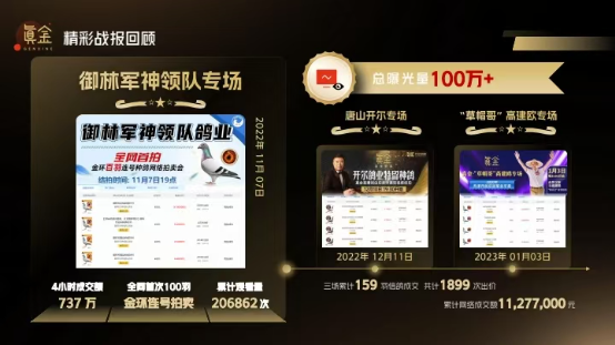 2) 公棚决赛、鸽王高位品鉴会:为公棚策划决赛直播及高位鸽品鉴会,邀请嘉宾对公棚的决赛高位和鸽王高位进行直播宣传,提升获奖鸽友以及公棚的知名度;