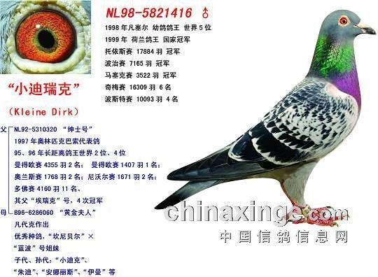 □“小迪克”(Kleine Dirk)NL98-5821416。自己也作出“年轻梦想”号(Young Dream)NL00-5063909,2002年荷兰全国长距离鸽王17位。以下只列“小迪克”部分子代女成就:A.代表子代世界名鸽“阿拉丁”(Aladin ),德国希巴赫·荣格所有。“阿拉丁”ד最后女郎”(“小迪克”全妹)作出“帝普士”(Tips爱亚卡普所有ML00-1925122),“帝普士”再生出世界名鸽“法拉迪巴”(Farah Diba NL02-1616137,玛丽·温克Marijke Vink作育),获西欧国家长距离鸽王1位和荷兰WHZB当日归长距离鸽王1位。“法拉迪巴”的全兄“雷纳”(Reza玛丽·温克作育)更加厉害:10598只冠军、29332只冠军、21892只冠军!“阿拉丁”近亲直女“小玛丽”NL04-2031628(“阿拉丁”ד法拉迪巴”,考夫曼所有),又作出“多兰”(Doran NL05-5533117),2007年NPO奥尔良全国9670只冠军(领先亚军13分钟)。B.代表子代“德基”(Dirky),荷兰彼得·文斯特拉所有。作出子代“达芬奇”(Davinci) NL04-5435151 入赏:荷兰全国NPO阿碧斯7946只597公里冠军和16733羽333公里亚军!C.代表子代“查理”(Charley),已高价售予美国。赴美前作出子代“快如闪电”×孙代“闪电红”获2009年NPO查特鲁全国冠军。D.代表子代02-502为荷兰雷腾兄弟作出子代女获2007年荷兰WHZB全国公鸽王1位及2008年布洛瓦NPO全国第3区冠军。E.代表直女为荷兰沃克父子作出直女Solange赢得2008年荷兰WHZB全国全距离鸽王1位。F.代表直女“Dirkje”,为荷兰杨·胡曼斯作出子代哈利(Harry),获2009NPO全国1日当日归长距离鸽王12位(布洛瓦NPO全国21650只冠军)。