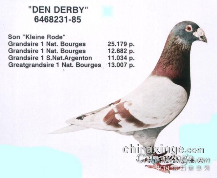 哈尔滨某强豪鸽舍使翔“特比”号直子94-6142712绛雄及“漂亮波治”(95年波治全国冠军-“钻石王老五直子)下代超级发挥,代表成绩2010年北京飙友赛鸽俱乐部千万元三关鸽王特比环大奖赛总冠军!哈尔滨另一强豪鸽舍使翔“特比”号直孙97-6178237灰雄,统治哈市多年!代表成绩11年秋季北京爱亚卡普公棚“天王杯”挑战赛加强赛冠军,万元组指定冠军。