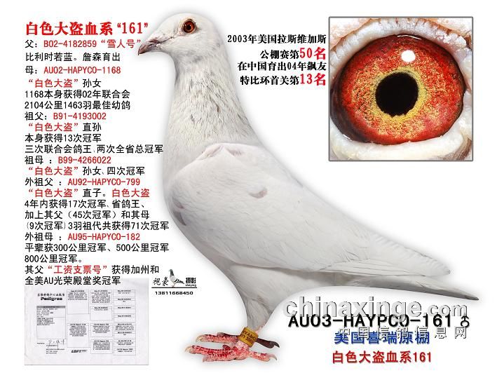 白色大盗鸽系来自美国喜瑞鸽舍"白色大盗“詹森鸽系多年前,美国喜瑞鸽舍"白色大盗“迷人羽色及高贵血统,辉煌成绩所倾倒,