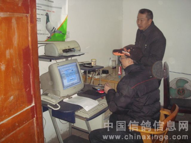 亲自上阵:县火车头鸽会主席张义和操作电脑,为电子扫描的鸽友集鸽、把赛鸽的相关资料录入鸽会电脑.县鸽会主席张伯常也前来助阵.