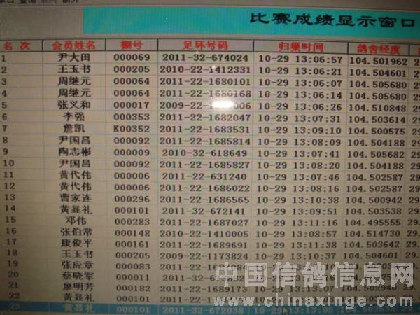 名次 鸽主姓名 足环号 归巢时间 空距(千米) 分速(米/分)