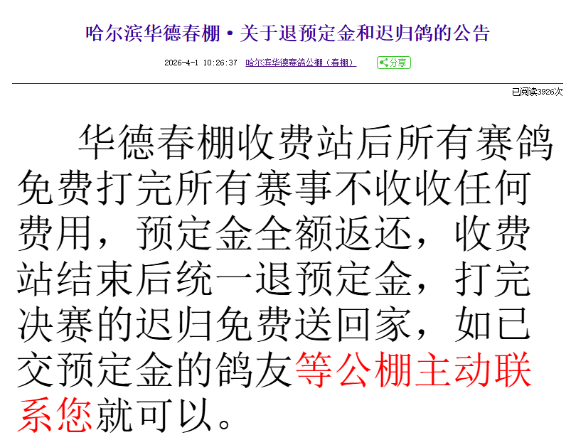 今日公棚再出公告,100公里归巢的鸽子继续比赛,决赛后免费送回,退预定金。但是不参加友谊赛执意取回赛鸽者,要交350元并且自取赎回!