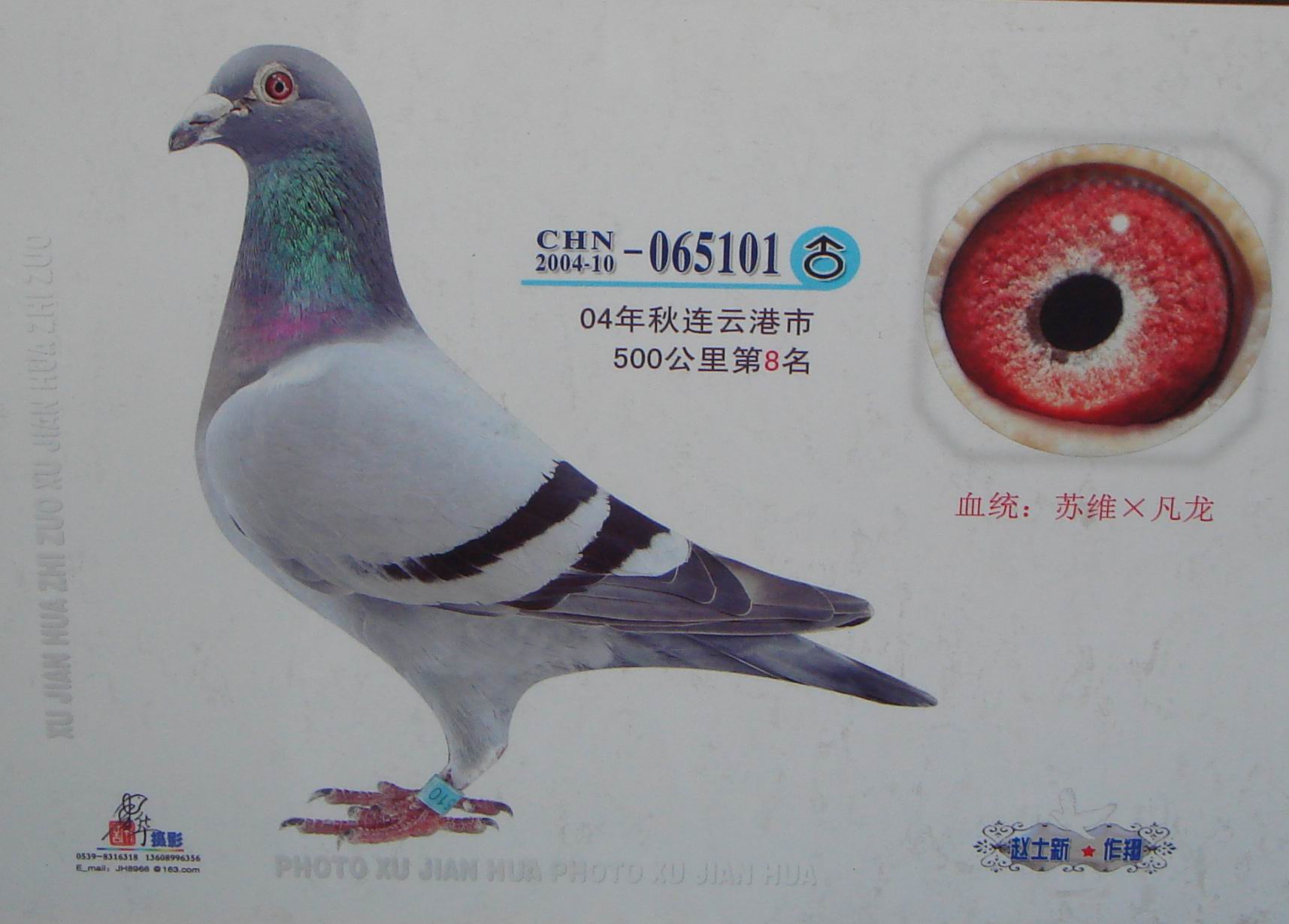 中飞鸽舍(连云港市开发区猴嘴镇新南街化工巷5号)本棚先后引进:苏维克、凡龙、VIP、克拉克、桑杰士、詹森、扬阿腾等血统。这些优秀种鸽自身都是赛绩鸽。在300公里、400公里、500公里、700公里比赛中获得优秀赛绩。其子代、孙代在港城和外地公棚发挥出色。本鸽舍愿与广大鸽友切磋交流,互勉共进。……