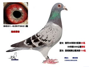 本人所养鸽子.以詹森.和桑杰士为主,自从2004年开始养鸽以来取得300公里亚军两次,10名以内多羽,并在500公里前10名以内获奖多羽.08秋季大奖赛[500公里]6名,普赛11名,本鸽09年春300公里7名。同场另一羽季军。09年秋开封铁路百日令9名,09年秋明翔公棚114名,交鸽一羽。10年300公里8名,500公里大奖赛季军。……