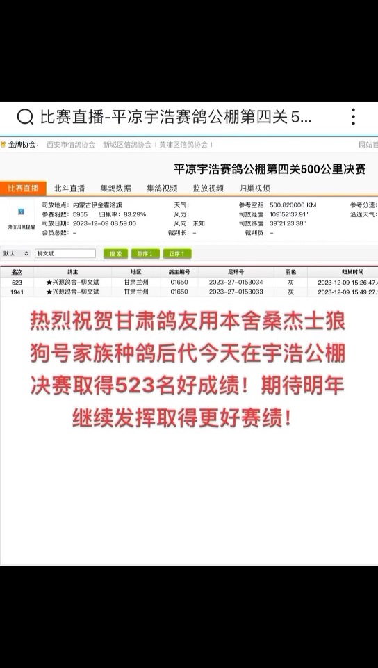 热烈祝贺甘肃鸽友用本舍桑杰士狼狗号家族种鸽后代今天在宇浩公棚决赛取得523名好成绩!期待明年继续发挥取得更好赛绩!