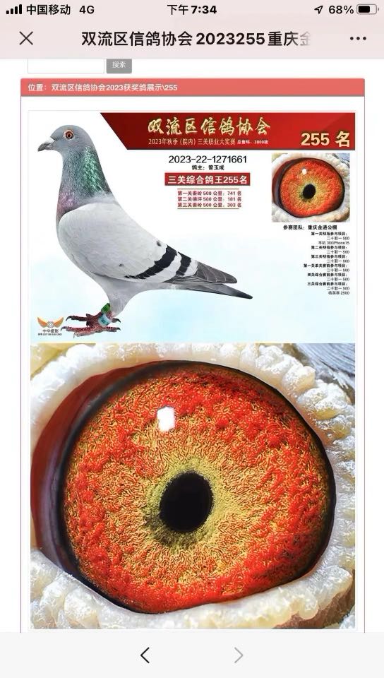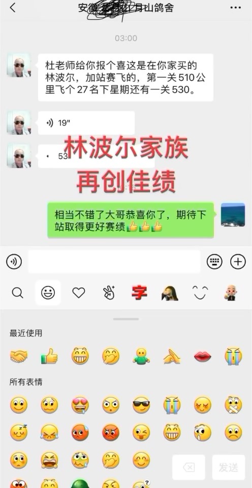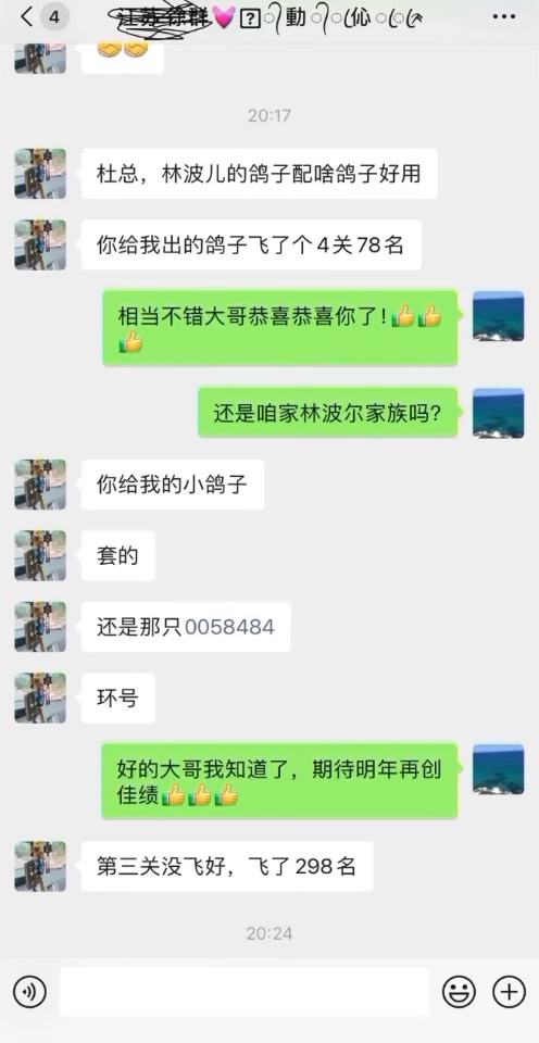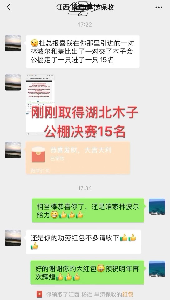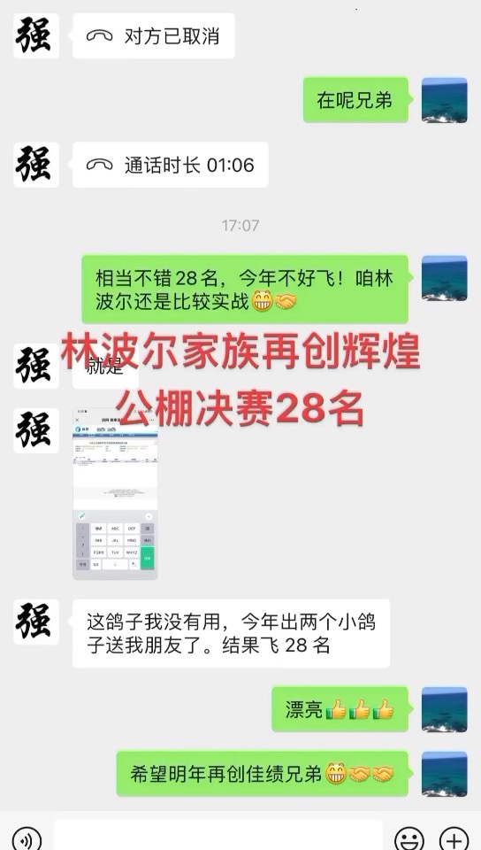 热烈祝贺江西鸽友用本舍林波尔家族/盖比今天在湖北木子会公棚决赛取得15名好成绩!也感谢鸽友发的红包,希望明年继续创造辉煌战绩!种鸽品质决定未来,赛绩说明一切!
