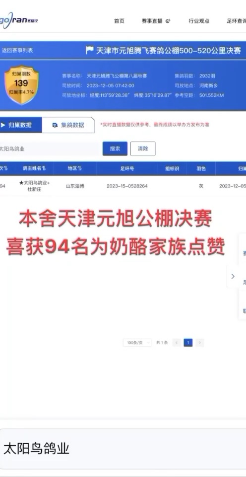 给自己鸽舍奶酪家族点赞!今天刚刚天津元旭公棚决赛喜获94名好成绩!追求实战,赛绩说明一切!