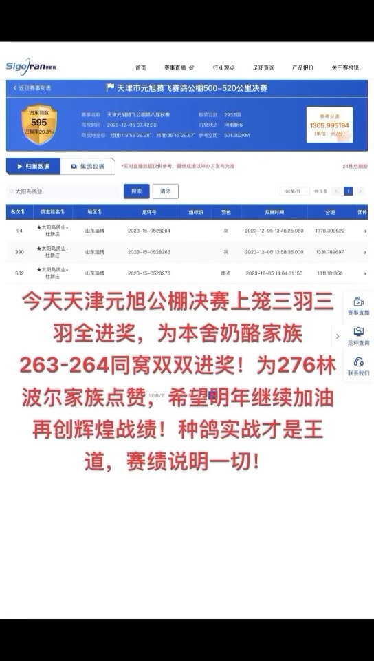 今天天津元旭公棚决赛上笼三羽三羽全进奖,为本舍奶酪家族263-264同窝双双进奖!为276林波尔家族点赞,希望明年继续加油再创辉煌战绩!种鸽实战才是王道,赛绩说明一切!