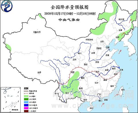 受中等强度冷空气影响,我国淮河以北大部地区将先后出现4~6级偏北风;内蒙古中东部、东北、华北、黄淮等地气温将下降6~8℃,其中东北大部、内蒙古东部的部分地区降温幅度将达10~12℃;内蒙古东北部、东北大部将有小到中雪或阵雪。 图:2008年12月17日8时—12月18日8时全国降水量预报图
