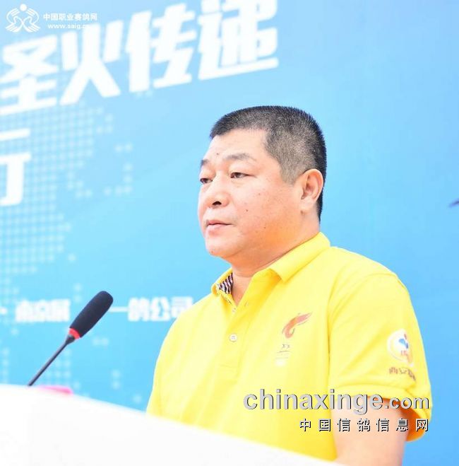 今天,中国鸽界奥运圣火将从这里出发,行进万里,传递全国。我认为这在中国乃至世界信鸽发展史上,都是一个里程碑!并将对中国信鸽事业的发展产生巨大而深远的影响!最后我愿和大家一起,全力保护好我们的火种,全力支持好为我们照亮前进道路的这支充满朝气的年轻队伍!谢谢大家!