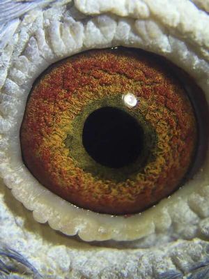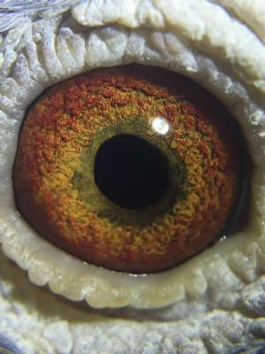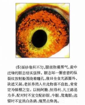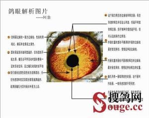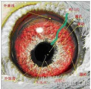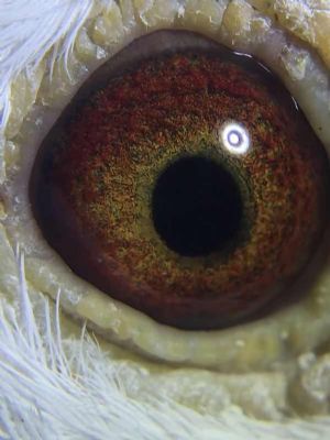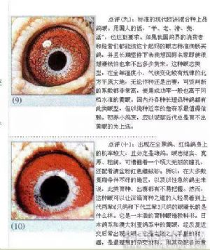 八、鸽眼瞳孔在阳光明暗处收缩反应明显,黄眼眼底呈浅黄,砂眼眼底呈粉白,(纯合眼志)杂色多则次之。眼皮大一些关系不大,眼皮颜色无妨。