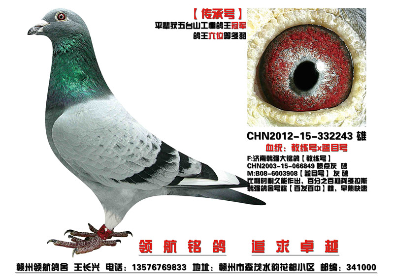 赣州领航鸽舍(Pilot Loft)主人简介: 赣州领航鸽舍主人从小爱鸽,五岁饲鸽,三十岁立棚赛鸽。现居于江西省赣州市。赛鸽理念:读书人以思想赛鸽,领航鸽以智慧夺冠;血统是定向的依据,健康是速度的保障!鸽舍简介: 本舍以华普利、胡本年轻艺术家、济南韩强鸽舍教练号直系等为主血。 &nb……