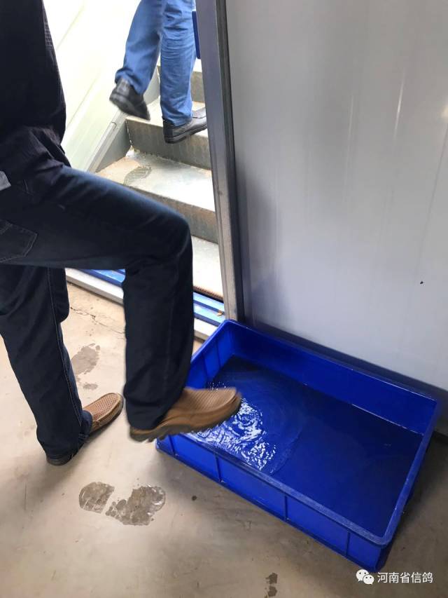 二话不说,先进鹏看鸽,进棚前,先给鞋底消毒▼