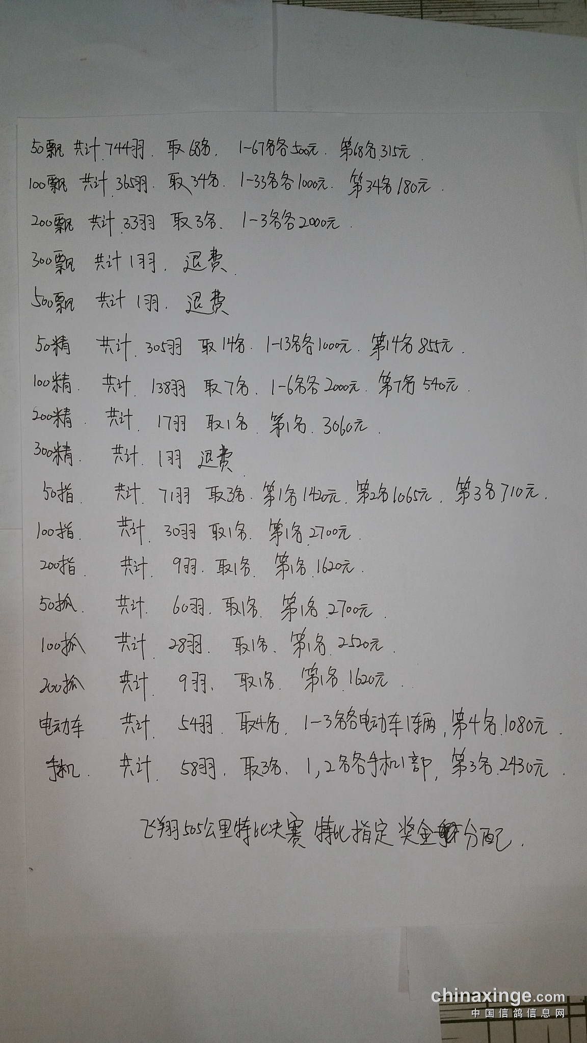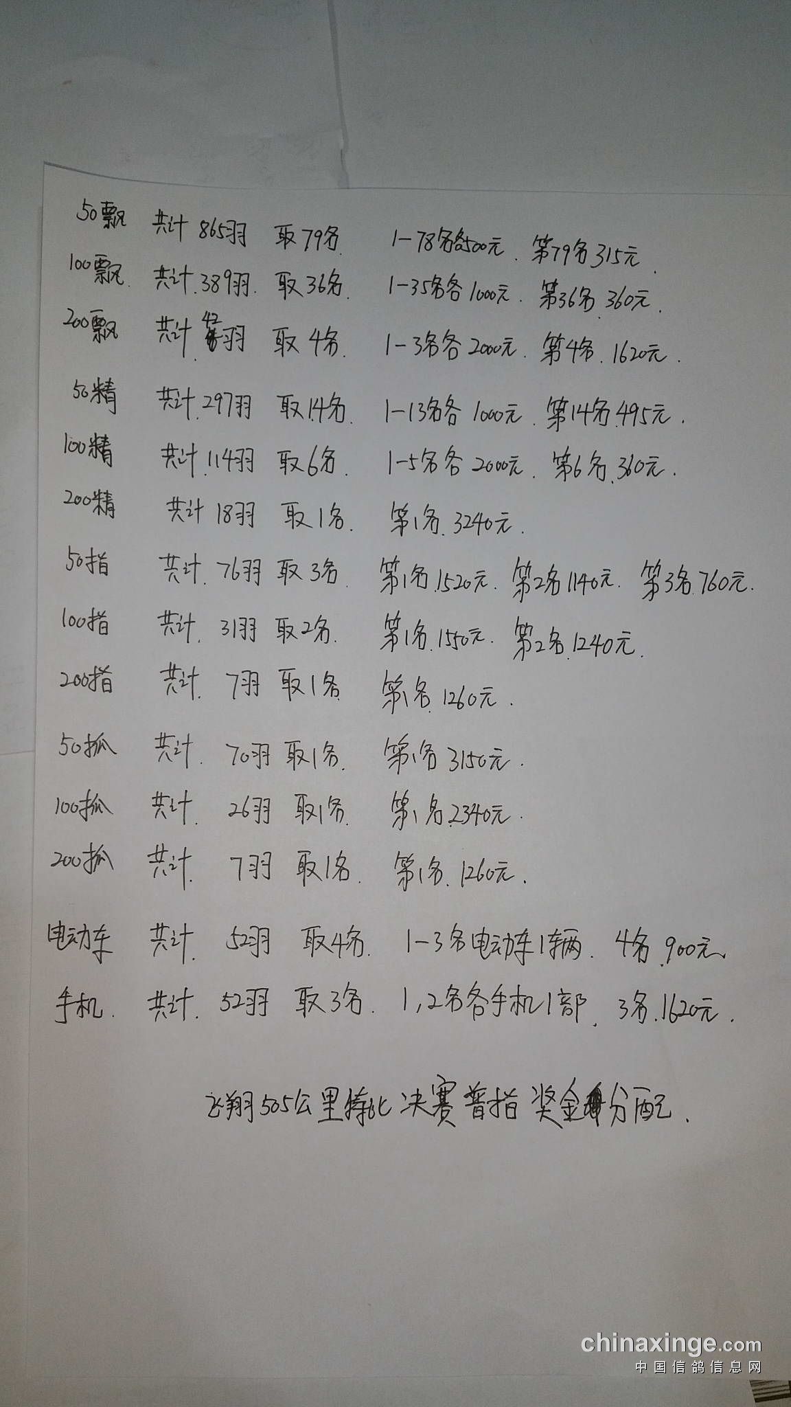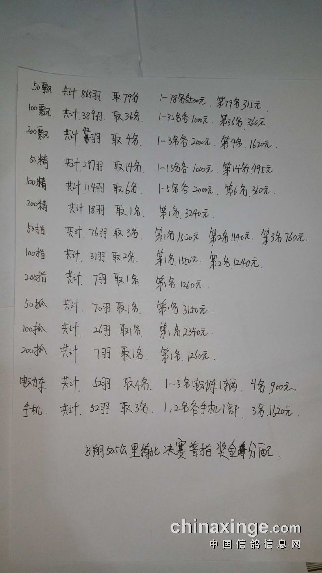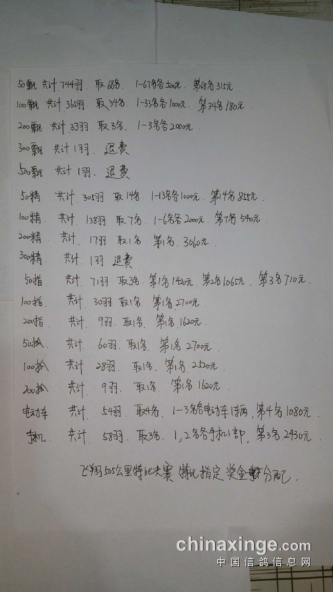 2017秋季飞翔赛鸽中心505公里-特比环决赛指定奖金分配