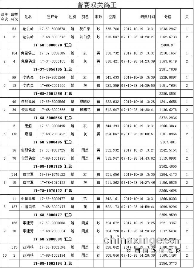 330,505公里普赛双关鸽王成绩