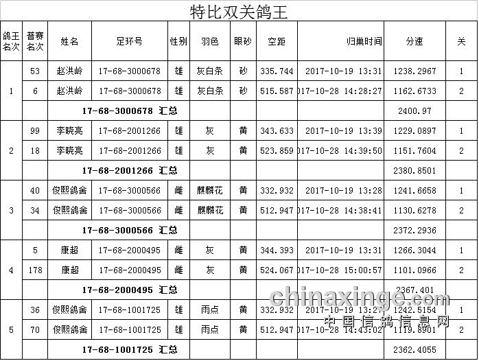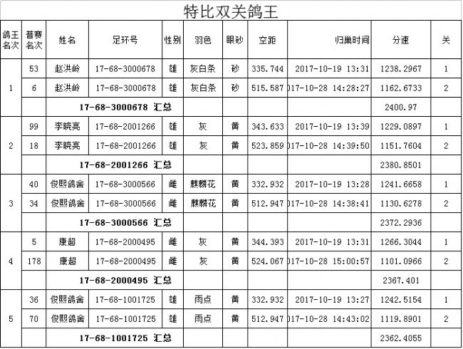 330,505公里特比双关鸽王成绩