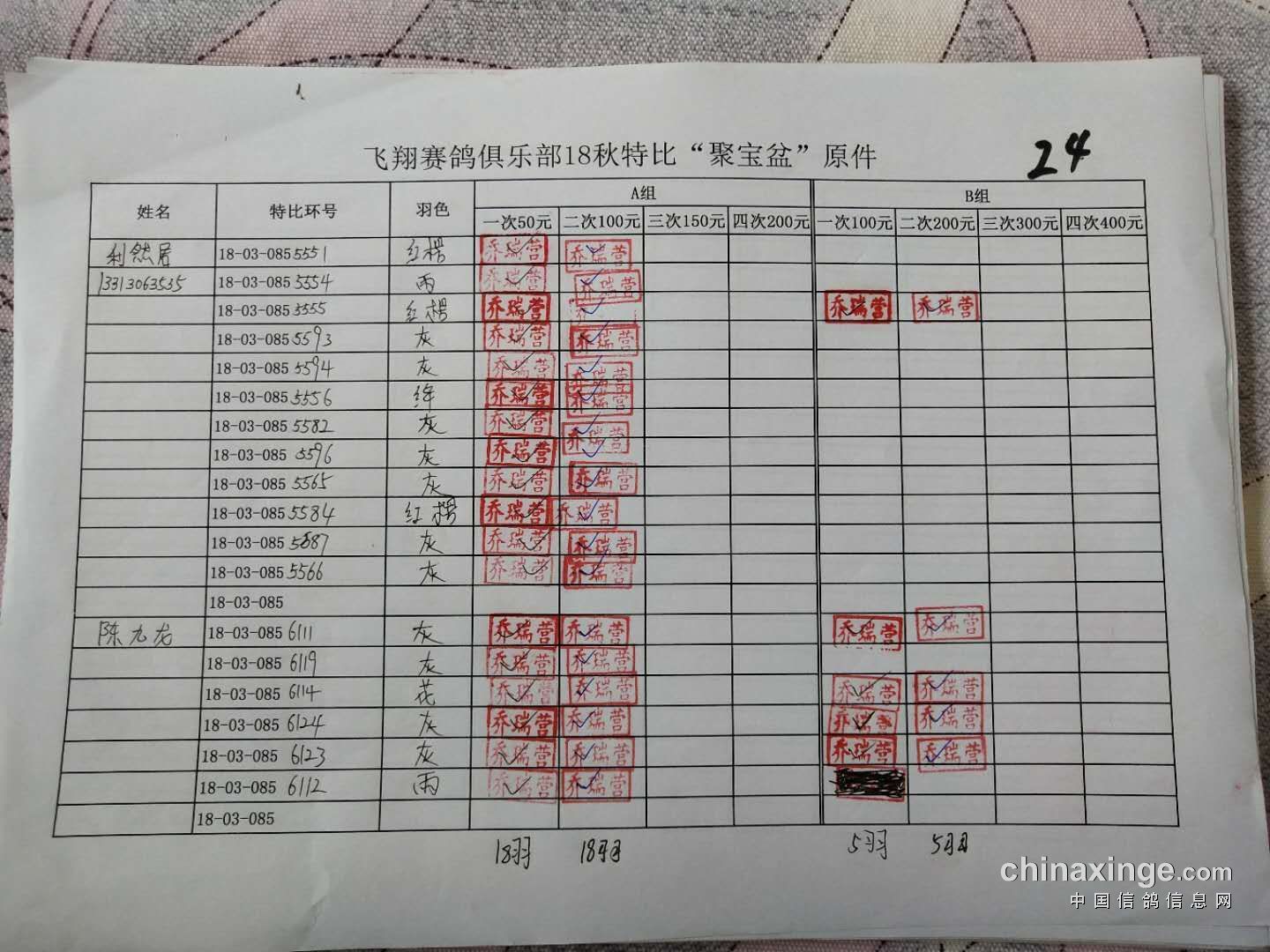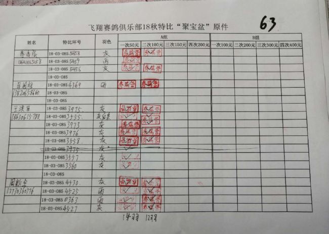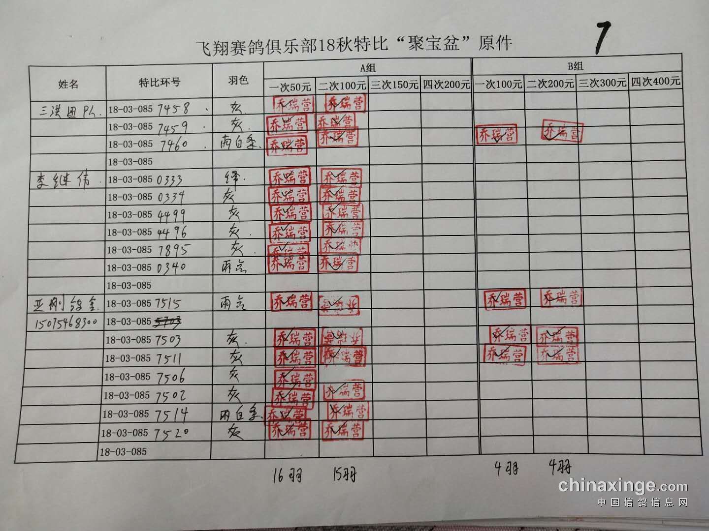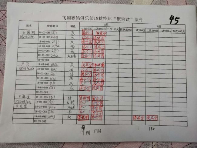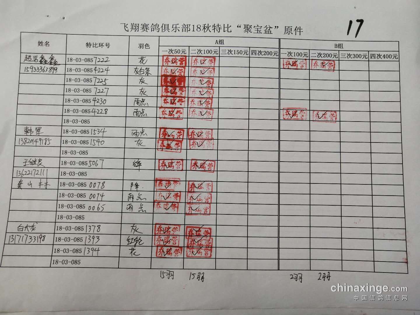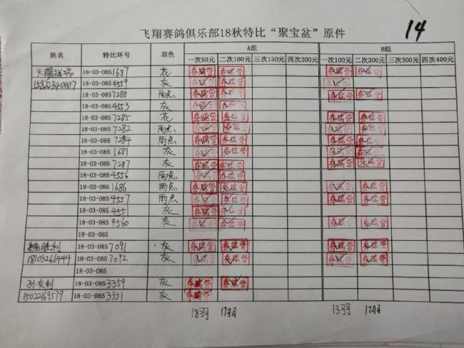 B组;第二次‘聚宝盆’共计287羽!失格17羽!