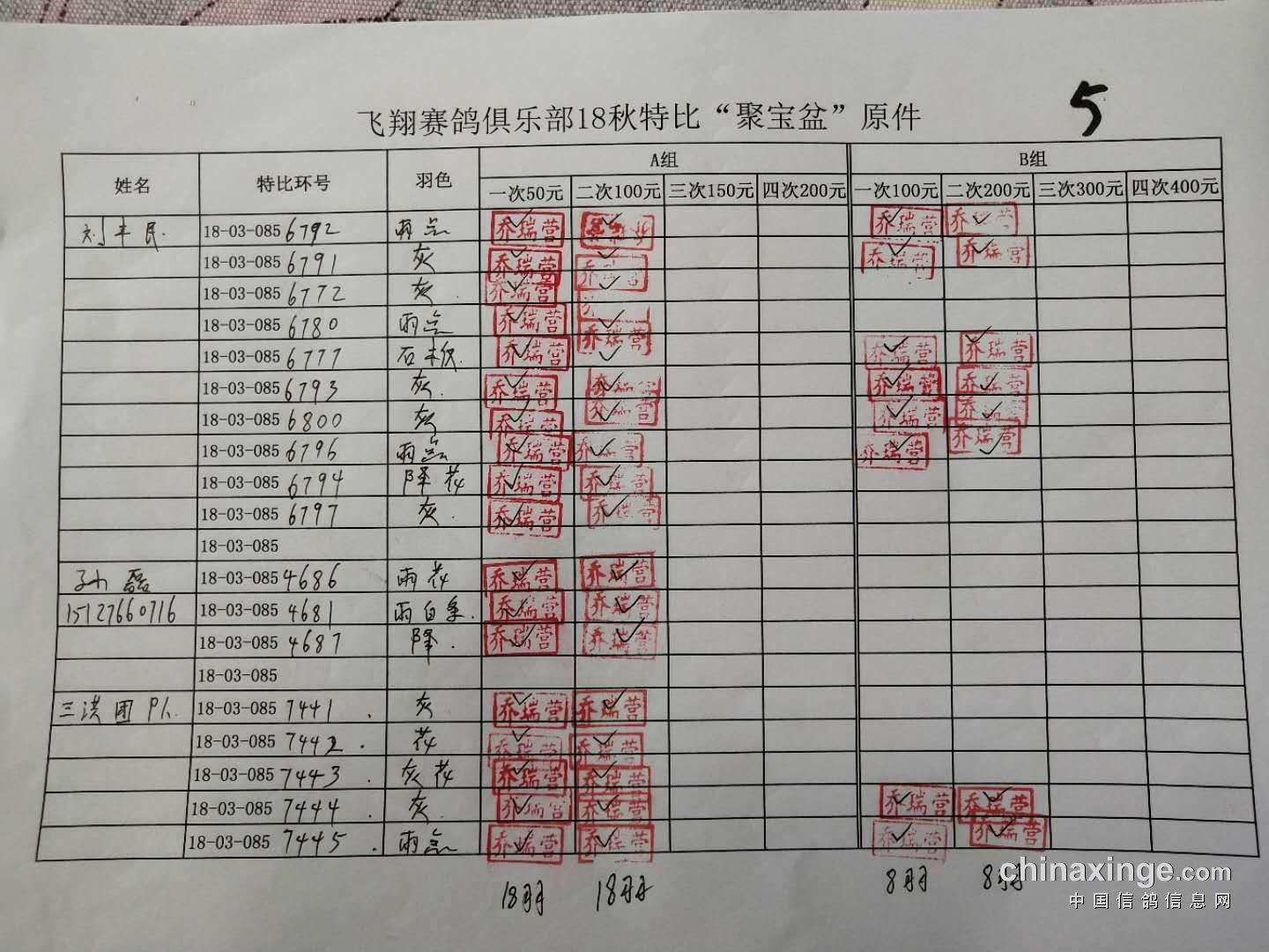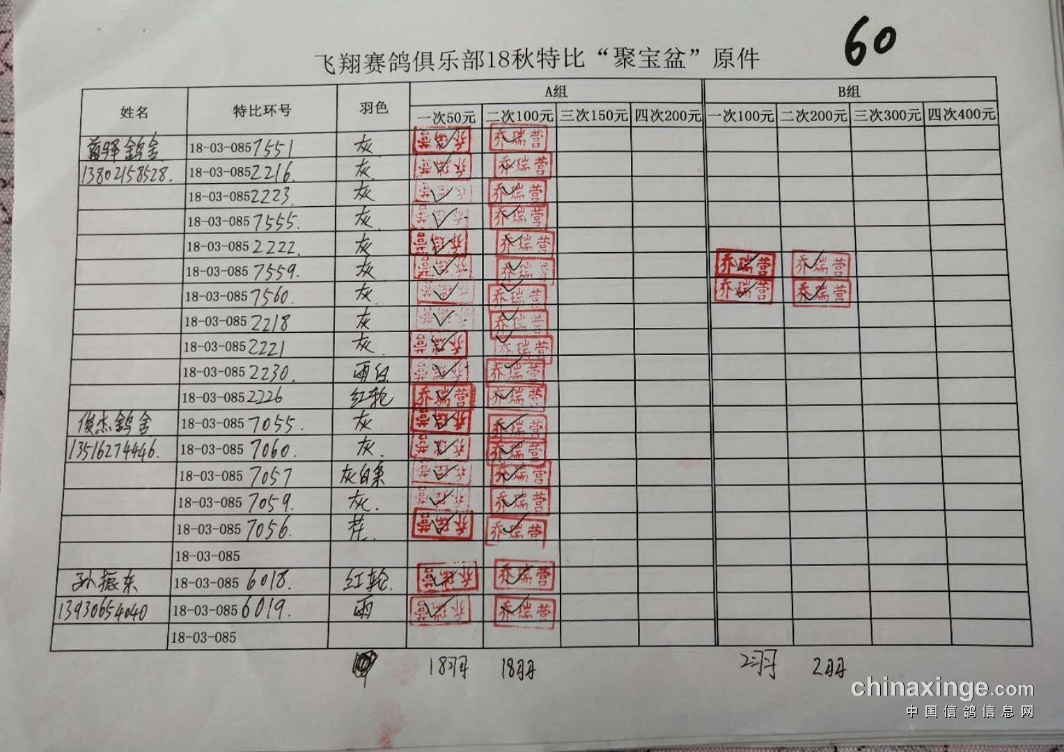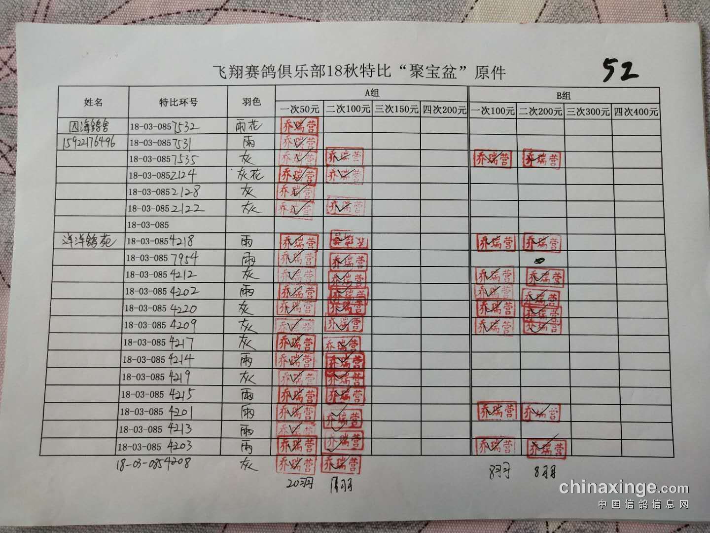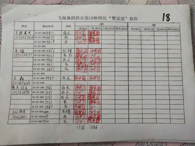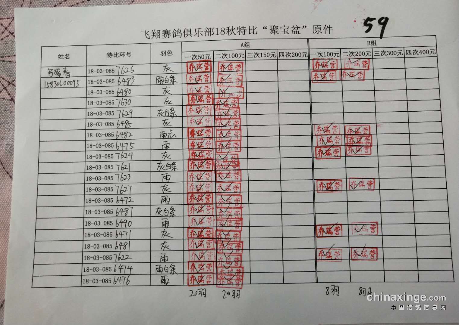 B组;第二次‘聚宝盆’共计287羽!失格17羽!