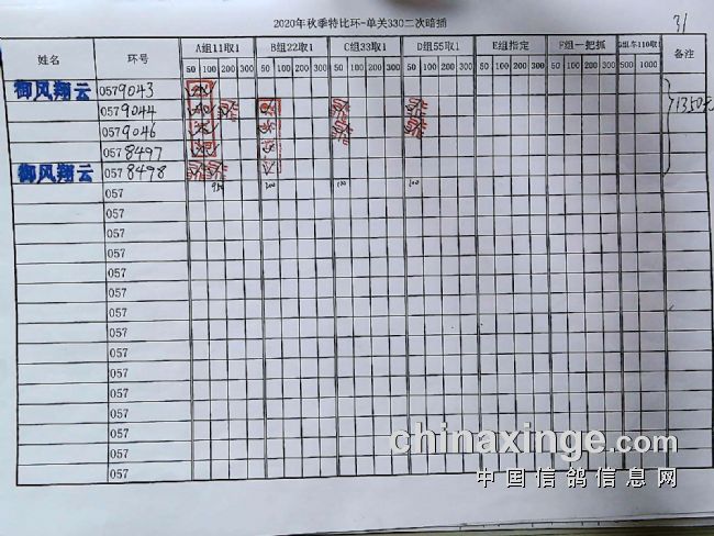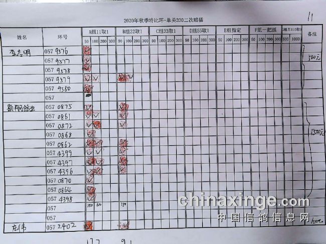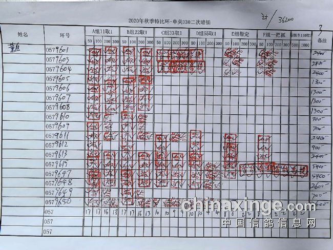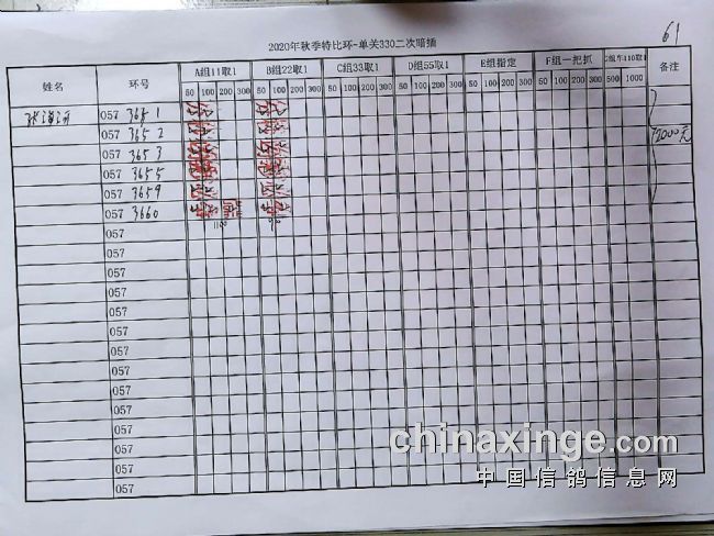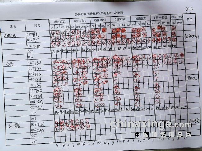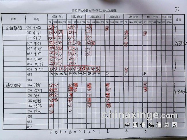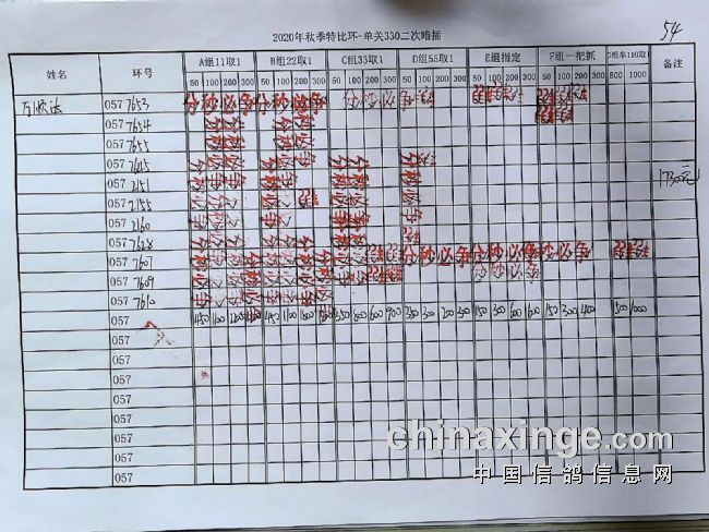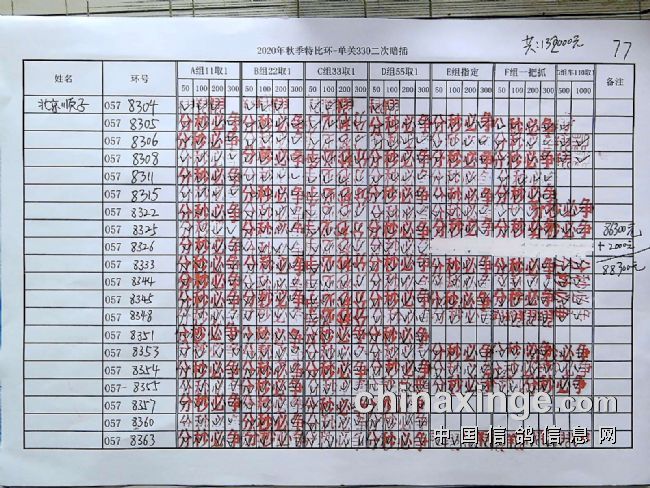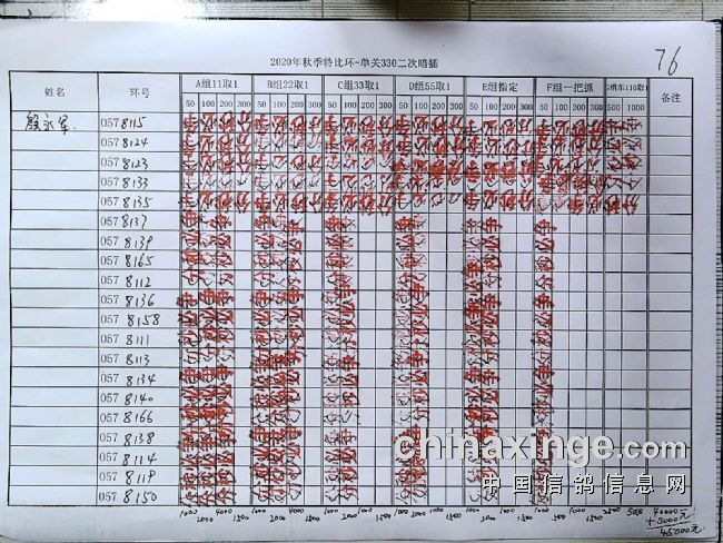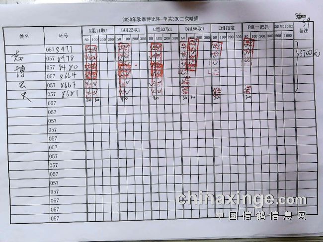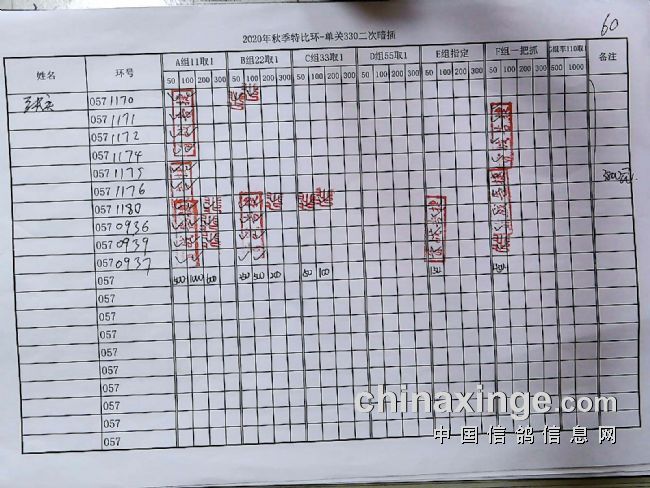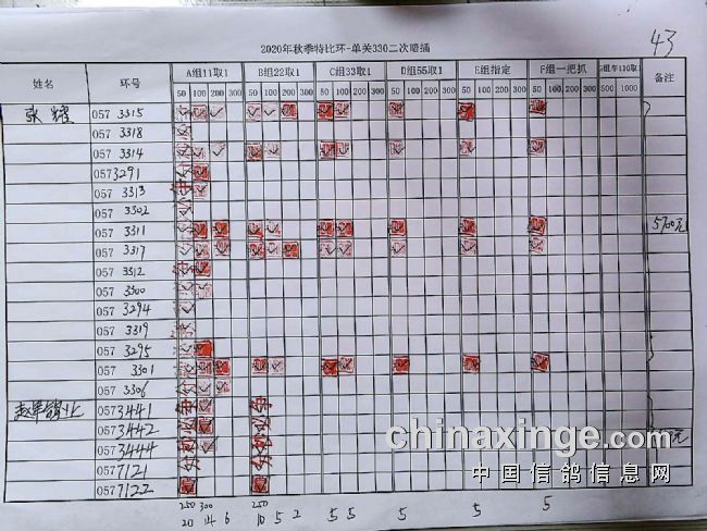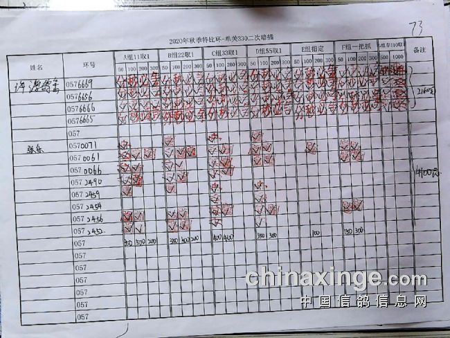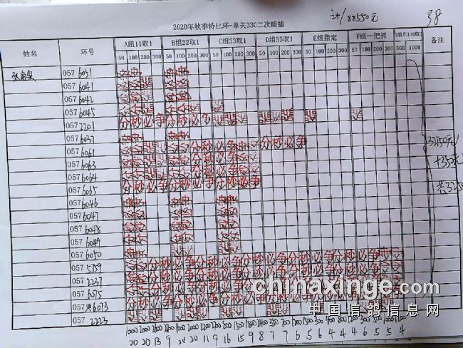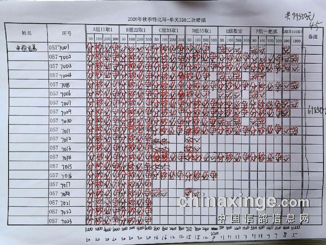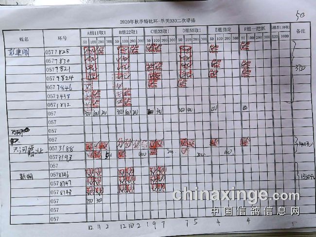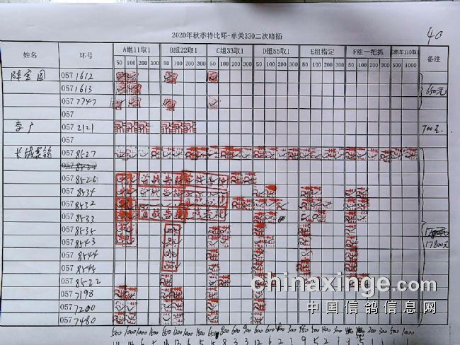 50组:共计388羽,取5名,1名5820,2名3880,3名2910,4名2910,5名1940。