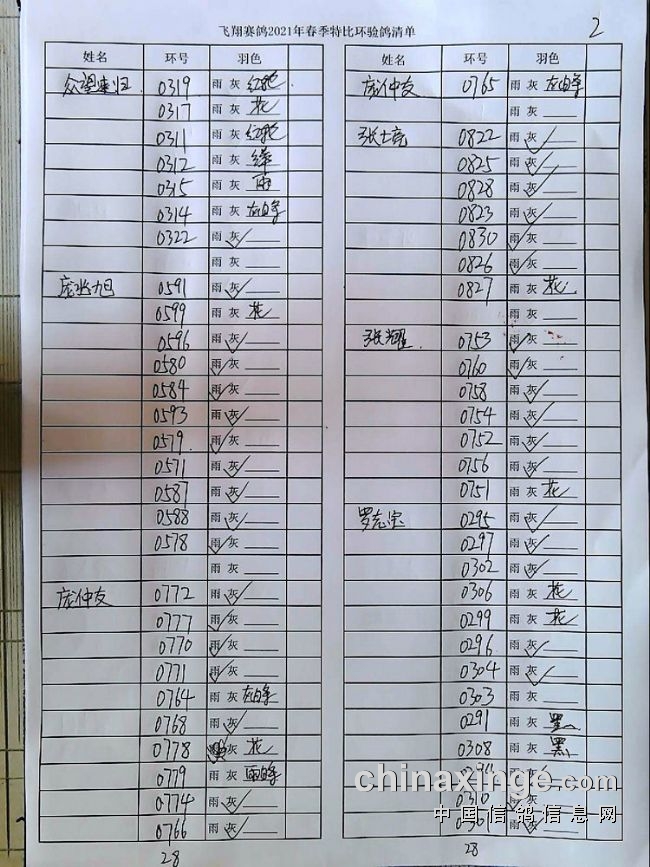 2021年春特比环验鸽清单