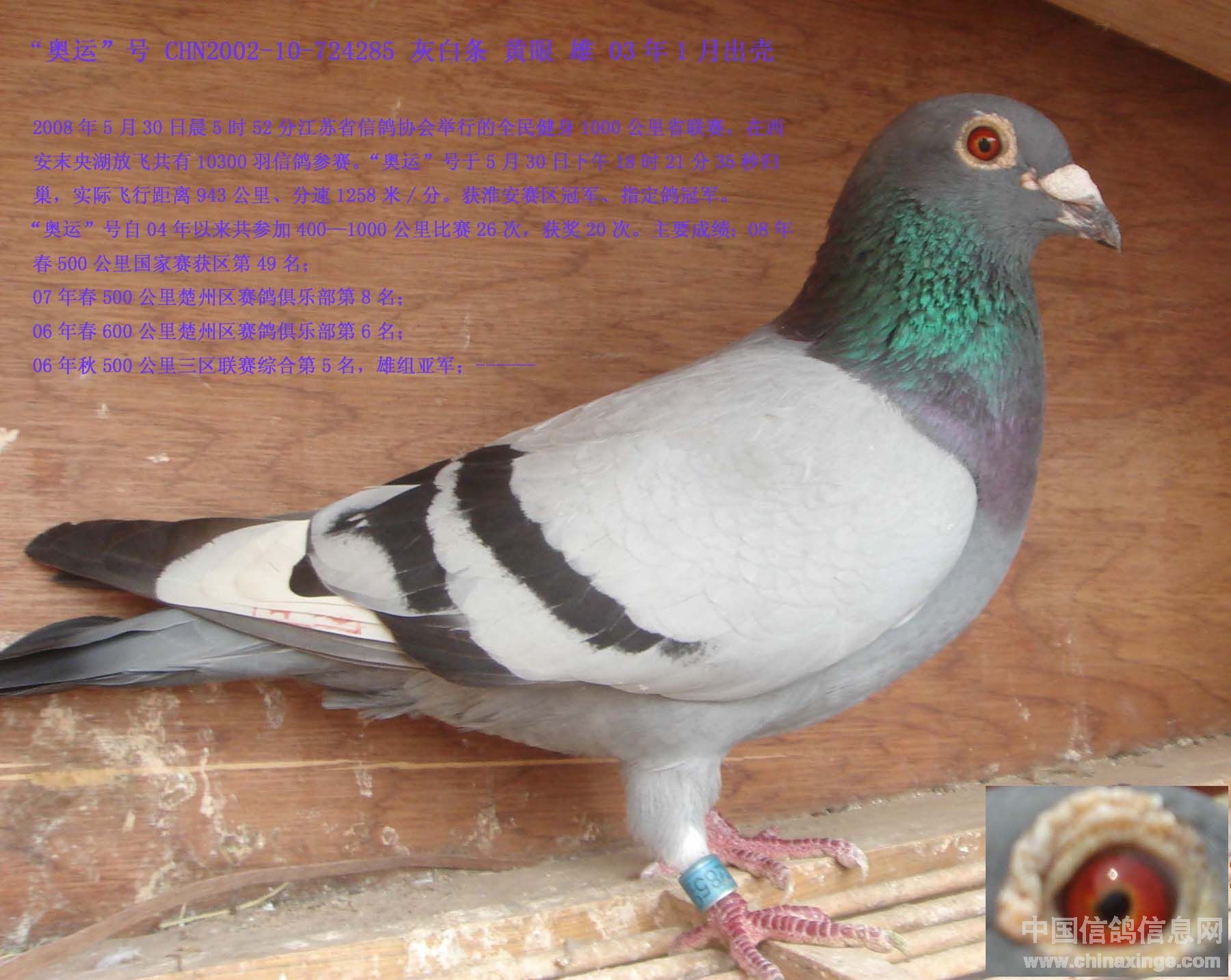 2008年5月30日晨5时52分江苏省信鸽协会举行的全民健身1000公里省联翔,来自苏州、南通、连云港、徐州、宿迁、盐城、泰州、镇江、扬州、淮安、常州、南铁·银鹰、无锡等十四个省辖市和行业鸽协共有赛鸽10300羽在西安末央湖放飞。本棚选送的“奥运”号于5月30日下午18时21分35秒归巢,实际飞行距离943.403公里,分速1258.57米/分;获江苏省全民健身1000公里联翔900公里级全省总冠军;淮安赛区冠军、指定鸽冠军。“奥运”号归巢后的图片