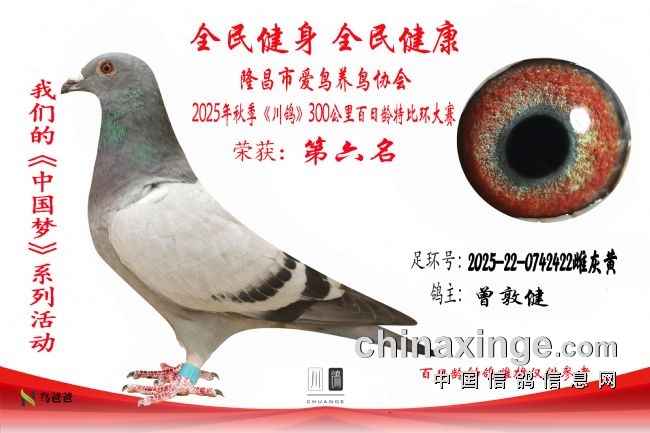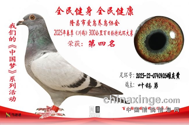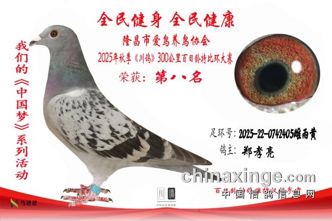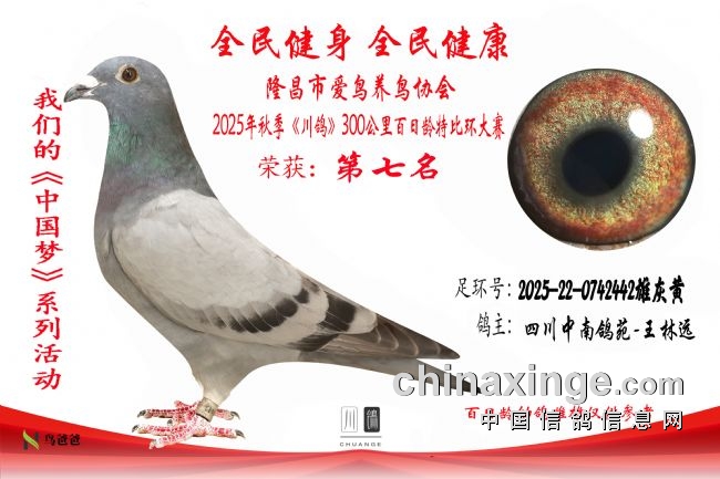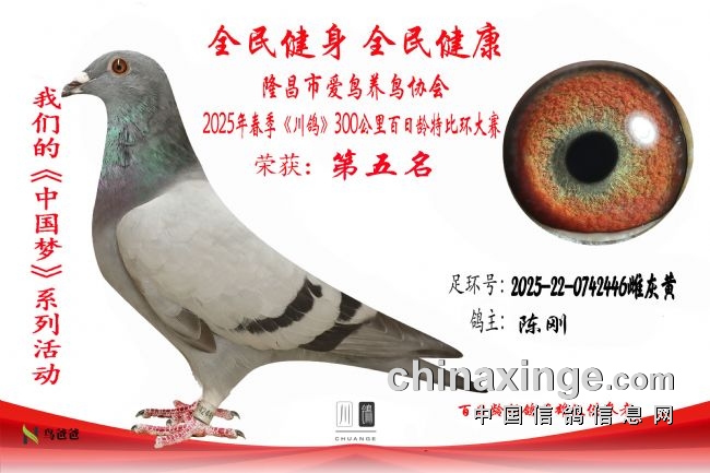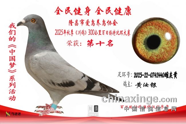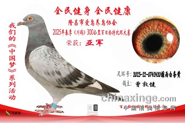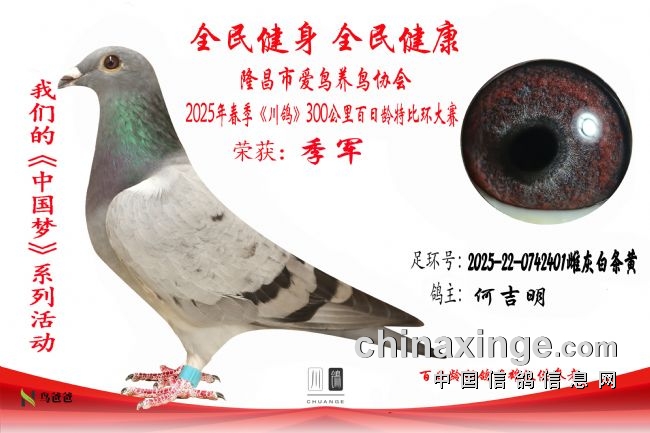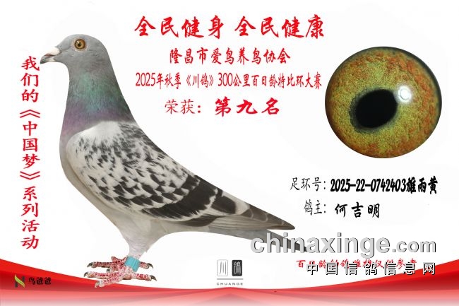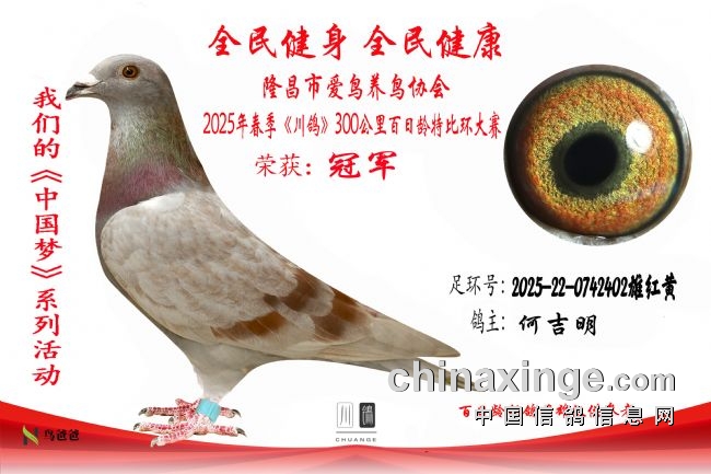 2025年4月7日,由四川省隆昌市爱鸟养鸟协会主办的《2025年川鸽百日龄特比环大赛》在广元市开笼。赛事当日,何吉明驯养的一羽脚环号为“2025-22-0742402”的红羽黄眼赛鸽,以分速1193.1364米/分的优异成绩拔得头筹,成为本届百日龄幼鸽特比环赛事的最大亮点。