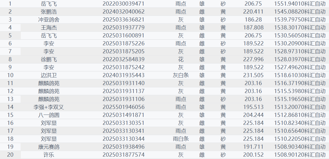 上午10时40分,鸽友岳飞飞的一羽砂眼雨点雄鸽便打钟报进,环号2022030039471,空距206公里,分速1551.9401米/分,获得本场比赛冠军。此外,岳飞飞麾下还有一羽赛鸽2025031600891获得第五。