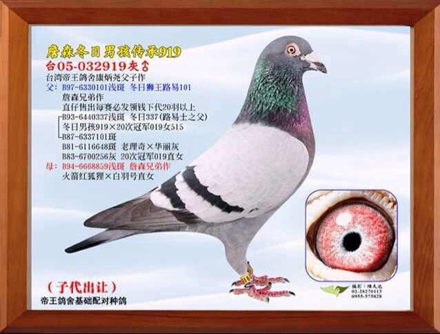 本舍以台湾帝王鸽舍康炳尧先生的冬日男孩919二代配三代近亲回血种鸽三代配四代近亲回血种鸽。荷比金矿331系,帝王鸽舍休斯肯双重近亲回血种鸽。本舍帝王鸽舍的种鸽五羽冬日男孩,近亲高代冬日男孩种鸽两羽,冬日男孩配4号西翁荣光姑娘三羽,迁移本舍近请广大鸽友参观指点,地址内蒙古乌海市乌达区兰孟军电话15174728320……