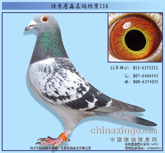 这羽雄鸽眼砂是黄眼,这是后期的鸽照,由海霸王拍得,结拍价是40000欧元,拍卖的当时还是一羽小鸽子。