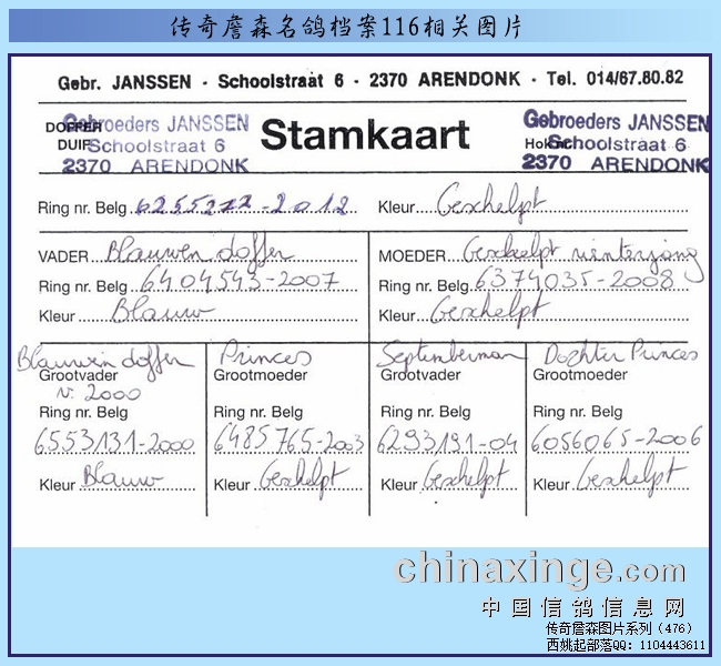 每一分钟的流逝、每一次加价的数目都让人心惊肉跳,下标者生怕下一秒爱鸽便属于他人。随着结拍时间的临近,本次拍卖的价格浮出水面,平均价格21390欧元/羽,创下了赛鸽界均价全球新纪录!全场拍卖总数折合人民币约350万元。这次拍卖的鸽子是詹森兄弟最后的作品也是孤品,以后任你再有钱也不会再从詹森兄弟那得到一羽鸽子,从此传奇落幕,在以后传奇詹森名鸽档案里将会收录这26羽名鸽,并会一一为鸽友们介绍也便于咨料的查阅,这次给鸽友们介绍的这羽鸽子是这26羽之中两羽幼鸽中的其中一羽。