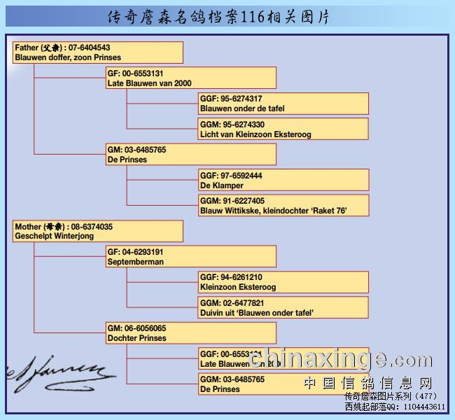 从这张血统联络图中我们能够看到父母的上代血统中都有公主号的身影,父亲是公主号的儿子,母亲是公主号的外孙女,这羽幼鸽属于舅舅配外甥女做出的作品。