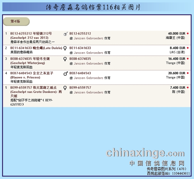 PIPA网则将詹森最后的25羽老鸽和两羽幼鸽进行全球拍卖。初夏的天气渐渐升温,闷热的夜晚让人躁动不安,时至2012年5月13日的夜晚,比利时赛鸽天堂PIPA网上一场众人期待的拍卖会正如火如荼地进入尾声。经过多日争夺,每一羽成鸽(幼鸽)都被拍上了高价。讲到詹森兄弟,全球有哪位鸽友不知他们的名字?数十年前他们的冠军奖品是半头猪,今日冠军则具有高昂现金价值。无论时代怎么演变,说他们是全球鸽坛之唯一传奇,绝对当之无愧!本次拍卖会吸引了来自世界各地爱好詹森鸽的鸽友的注意,大家都对这整舍仅有的24羽成鸽(种鸽)和2羽幼鸽虎视眈眈。此次拍卖分4场进行,于5月13日晚9点、10点、11点、12点结拍(结拍前15分钟内若有人下标将自动延时)。