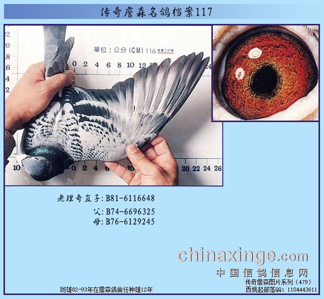 在詹森兄弟晚年育种体系里,有一羽低调却无比硬核的传奇种雄——B81-6116648,这羽雄鸽位列詹森八对种鸽的第二对,它没有炫目的赛绩光环,但这羽雄鸽却在詹森鸽舍育种十二年之多,648的眼砂是黄眼,这羽鸽子的眼砂是詹森兄弟非常喜欢的砂型。